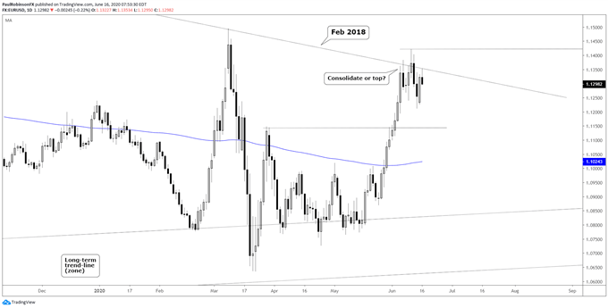 The EUR/USD rally since last month is at risk of failing, in-line with how it has behaved since early 2018. Rallies have been unable to hold for more than a week or so once they became extended. If price can maintain around trend-line resistance, then a change in character could be underway.